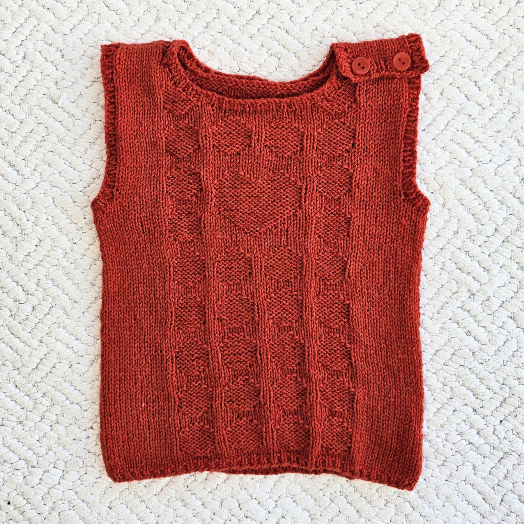 Du starter i bunden med rib og mønster i følge et diagram. Herefter deler du i for- og bagstykke og strikker hvert stykke færdig for sig. Den ene skulder samles med knapper, for at det er nemmere at få på. Det er samtidig dekorativt, så brug nogle fine knapper.